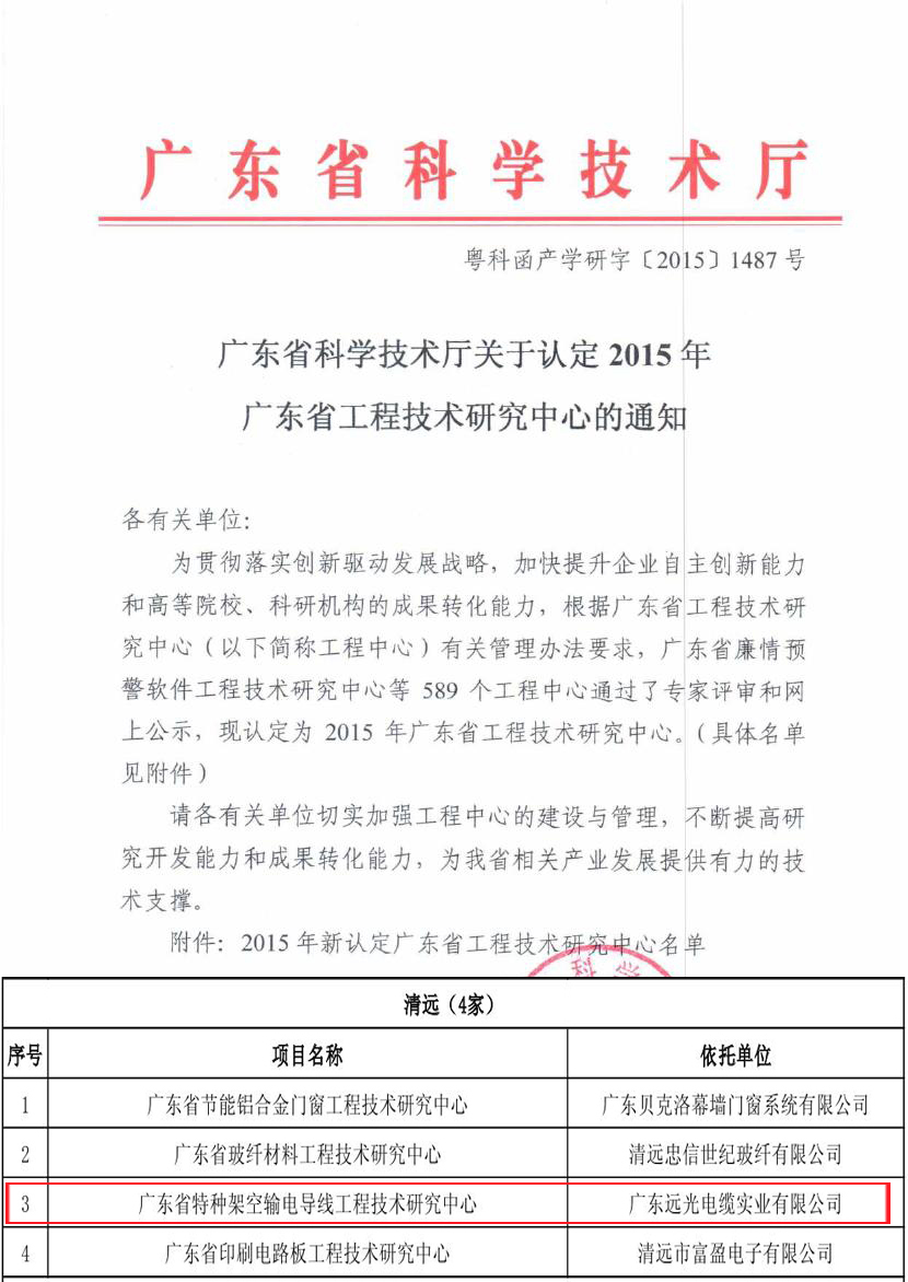 10月28日,广东远光电缆实业有限公司收到广东省科学技术厅文件,该公司“广东省特种架空输电导线工程技术研究中心”被认定为“广东省工程技术研究中心”称号。这一荣誉的取得,彰显着远光电缆在特种架空输电导线生产研发技术方面的雄厚实力。