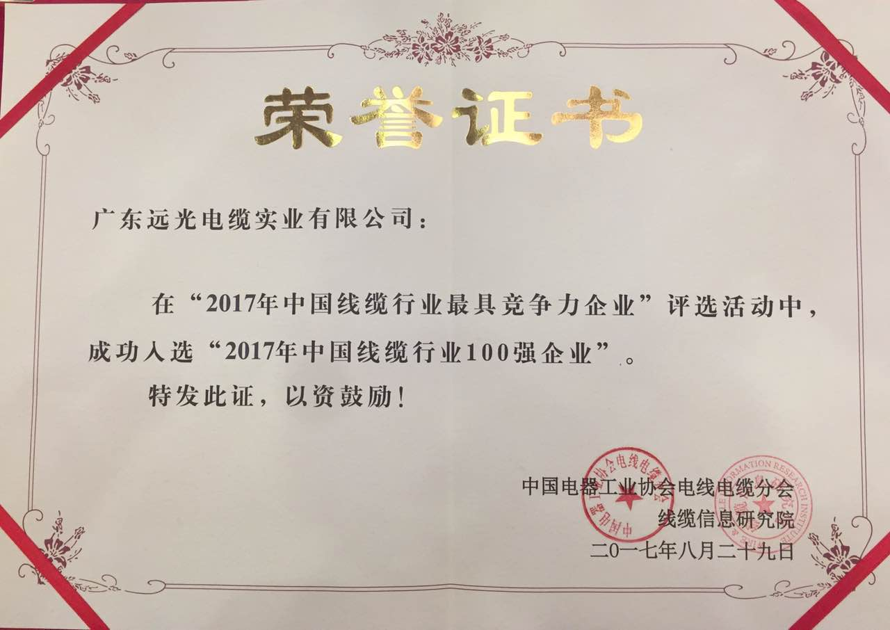 8月29日,2017年中国电线电缆行业大会在上海隆重召开,大会以“提质量、强防范、树品牌”为主题,揭晓了《中国线缆行业最具竞争力企业10强》榜单和《中国线缆行业100强企业》等,广东远光电缆实业有限公司凭着良好的销售业绩、优良的产品质量以及强大的技术创新能力,获得中国电器工业协会和电缆信息研究院共同颁发的“2017年中国线缆行业100强企业”荣誉证书。