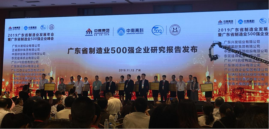 近日,由广东省制造业协会、广东省产业发展研究院、广东省社会科学院企业竞争力研究中心共同主办,以“新时代 • 新技术 • 新制造”为主题的2019广东省制造业发展年会暨广东制造业500强企业峰会在广州隆重举行。