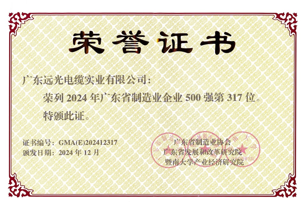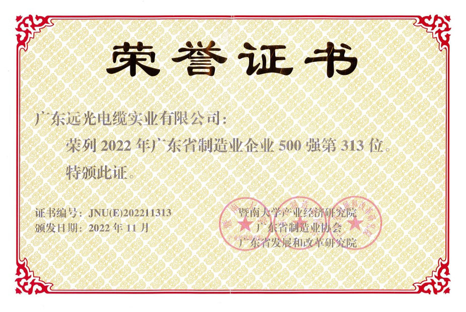 远光电缆荣列2022年制造业企业500强第313位
