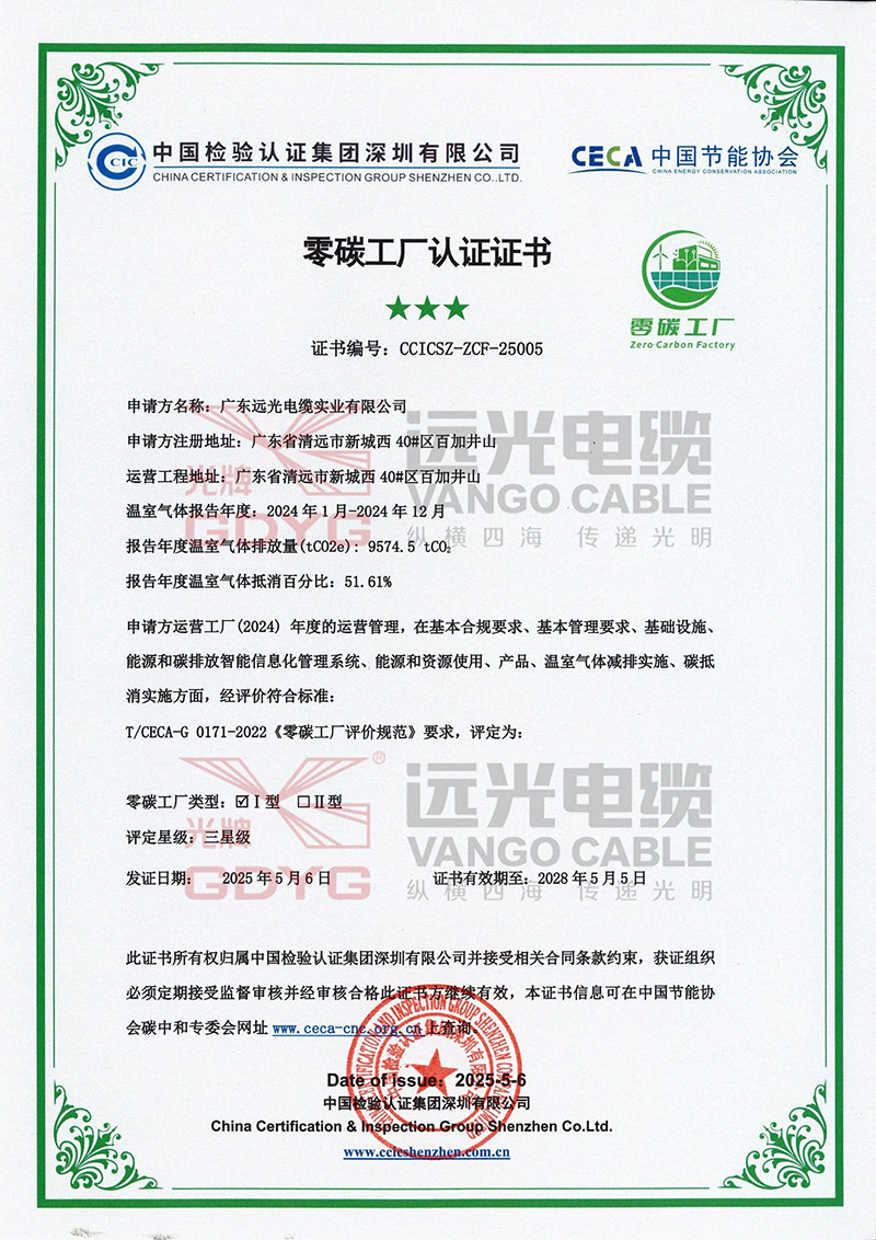2025年5月15日,广东远光电缆实业有限公司正式通过中国节能协会与中国检验认证集团深圳有限公司的联合评审,获颁“Ⅰ型三星”零碳工厂认证证书。作为电线电缆行业的绿色先锋,远光电缆积极响应国家“碳达峰、碳中和”战略部署,将可持续发展理念深度融入生产运营。继获评“国家级绿色供应链管理企业”“广东省省级绿色工厂”后,此次通过零碳工厂认证标志着远光在绿色制造、低碳转型领域取得里程碑式突破,为全行业绿色发展树立崭新标杆。