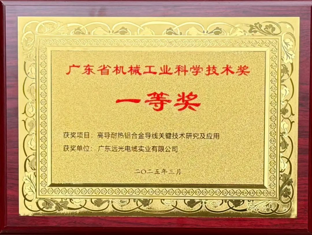 广东省机械工业科学技术奖作为省内机械制造领域最高科技荣誉之一,远光电缆凭借在绿色能源与材料创新领域的突出表现获得2项奖项!其中,“高导耐热铝合金导线关键技术研究及应用”项目荣获一等奖,“中压聚丙烯绝缘环保电力电缆技术研发与应用”项目斩获三等奖。