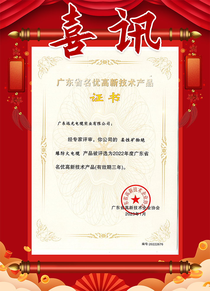 近日,广东省高新技术企业协会发布了《2022年广东省名优高新技术产品名单》,我司《柔性矿物绝缘防火电缆》成功入选,以卓越研发实力和产品品质再获权威认证,这标志着我司产品在科技创新方面又取得了新的成果。