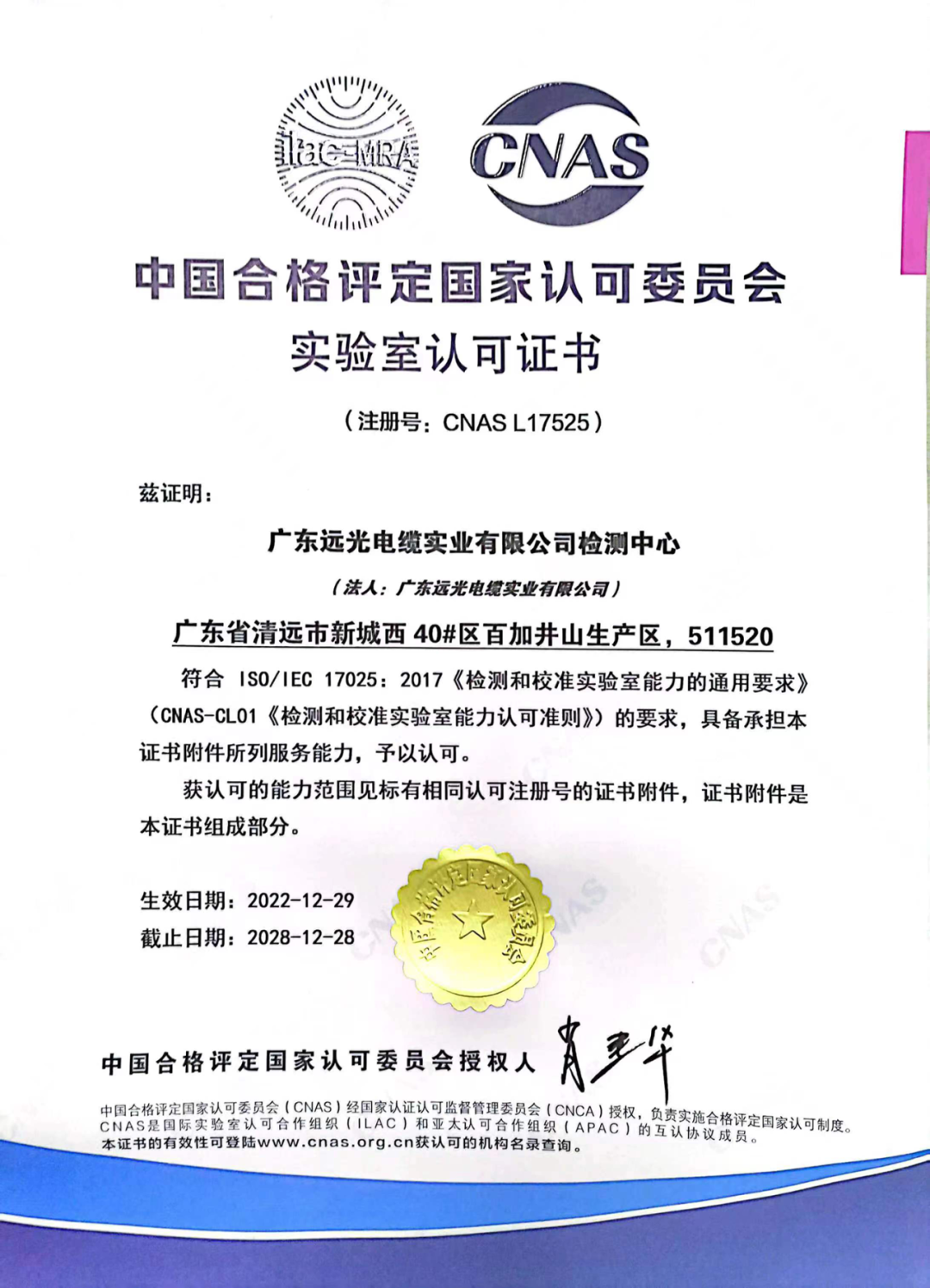 近日,远光电缆检测中心成功通过CNAS国家实验室认可标志和ILAC国际互认联合标志,获得由中国合格评定国家认可委员会颁发的实验室认可证书,注册号:CNAS L17525。通过CNAS认可,标志着远光电缆检测中心具备国家及国际认可的管理水平和检测能力,夯实了测量保证的基础,为企业提供优质的技术服务,为产品质量安全保驾护航。