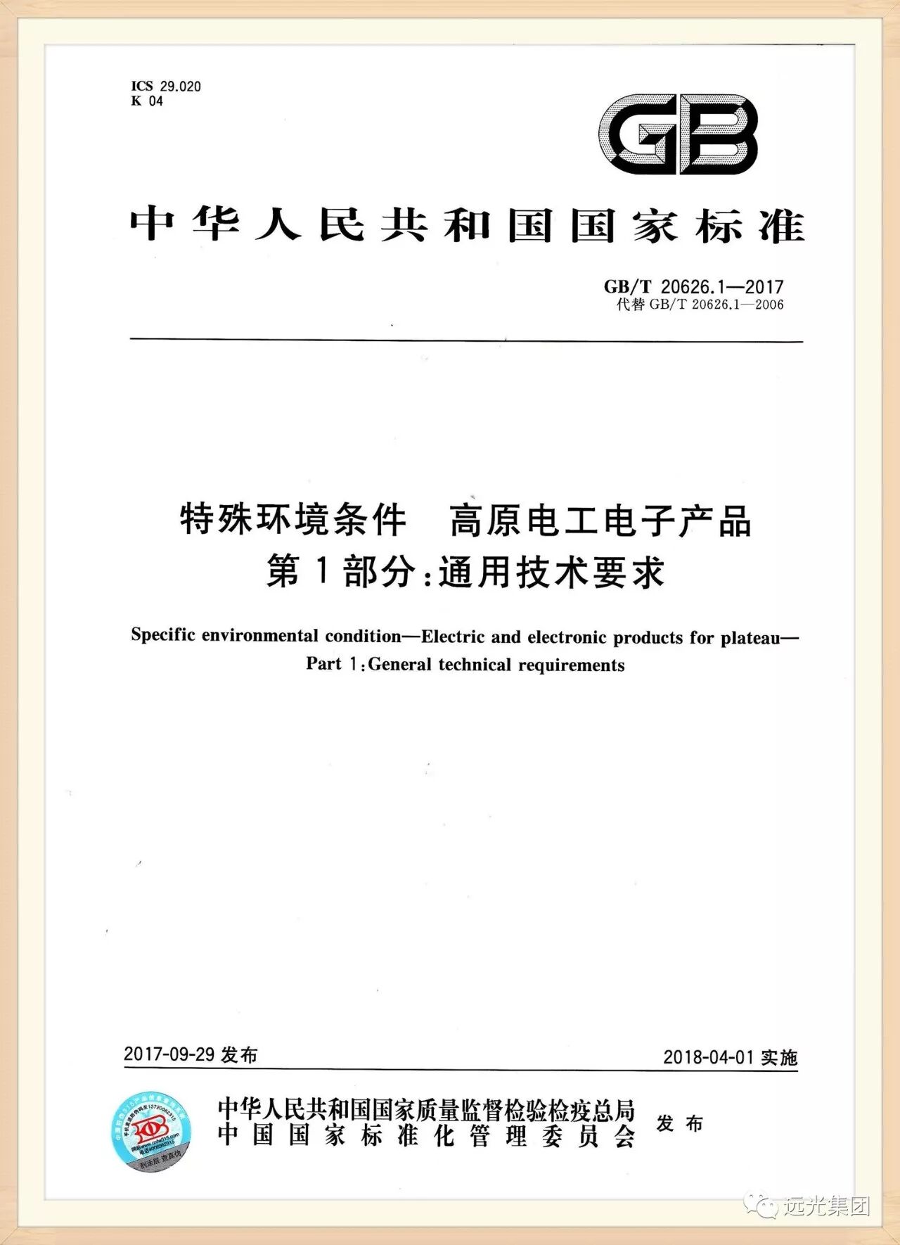 2017年9月29日,中华人民共和国国家质量监督检验检疫总局和中国国家标准化管理委员会共同发布了由广东远光电缆实业有限公司参加起草的GB/T 20626.1-2017 《特殊环境 高原电工电子产品 第一部分:通用技术要求》,标准将于2018年4月1日正式实施。