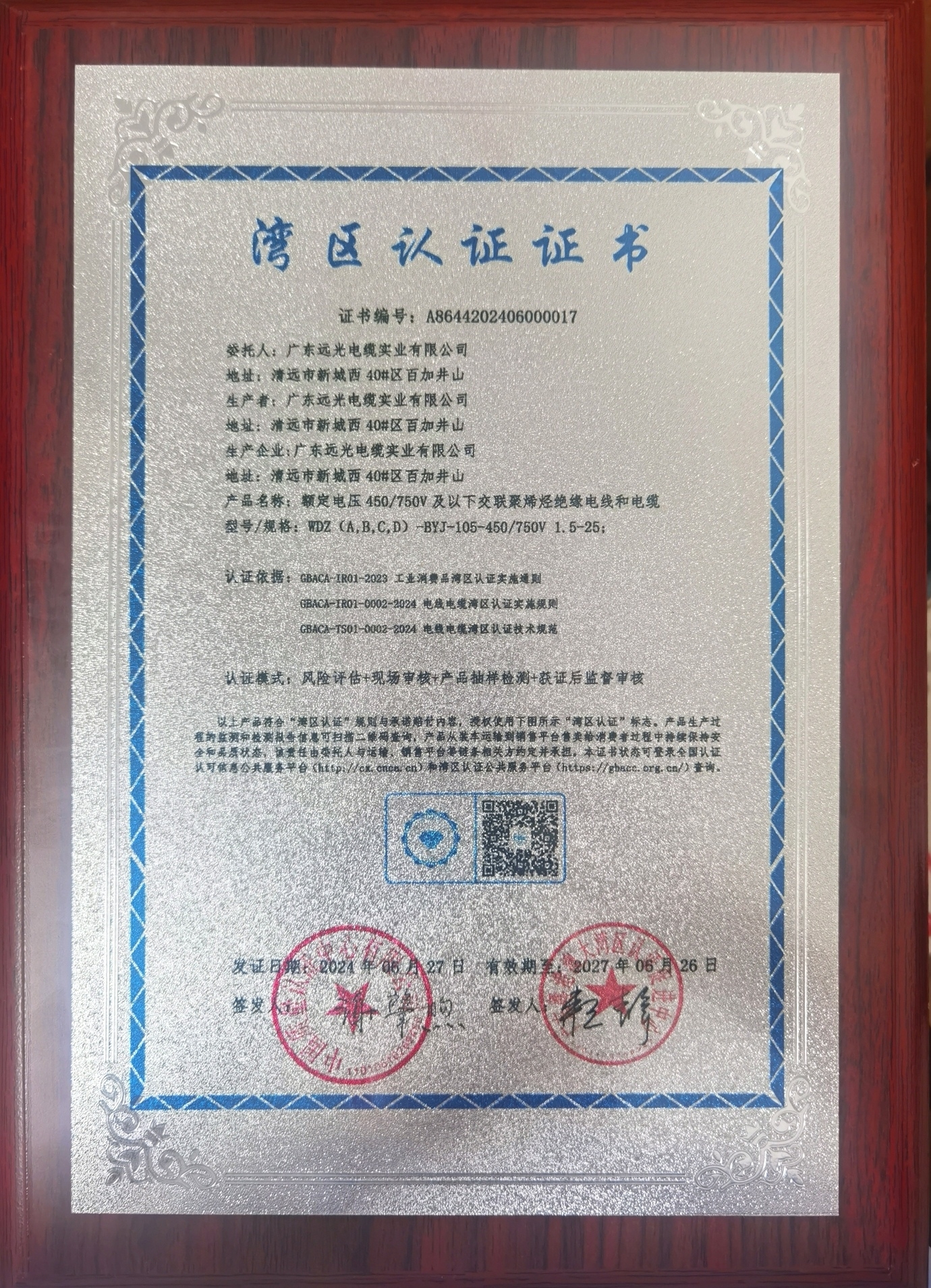 2024年6月27日,广东远光电缆实业有限公司生产的“额定电压450/750V及以下交联聚烯烃绝缘无护套低烟无卤阻燃电线电缆”获颁清远市首张“湾区认证”证书,成为清远市首批获得“湾区认证”的企业,为清远市制造业开拓粤港澳大湾区市场增添强大动力。