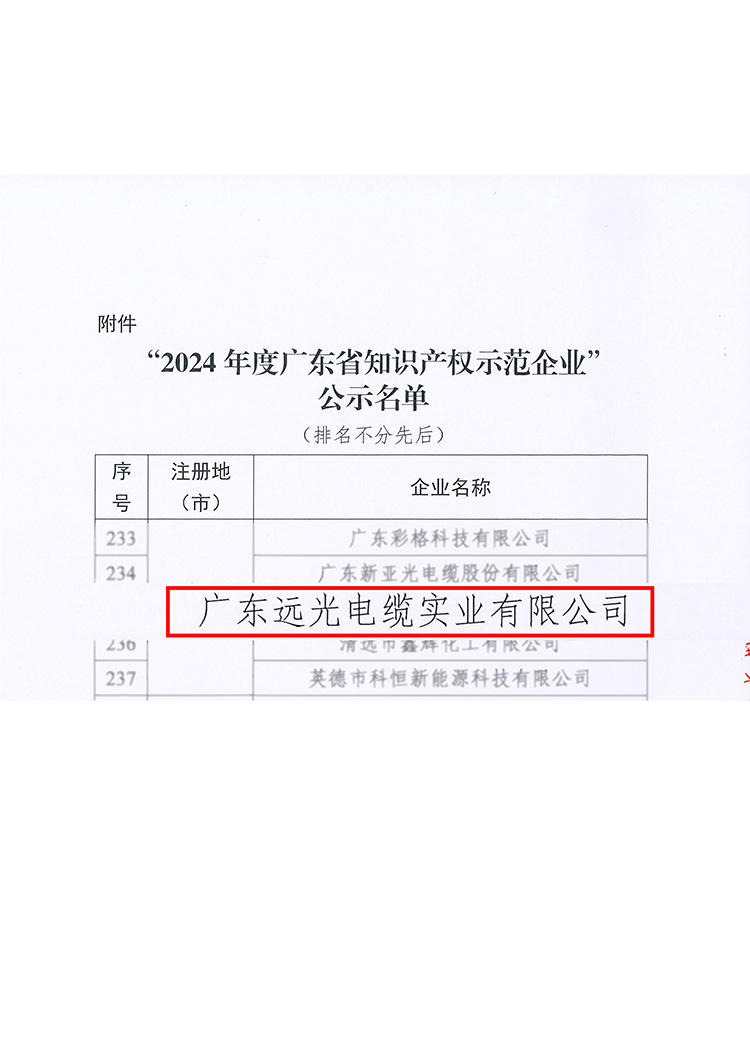 时代在发展,远光也在前进。近年来,远光电缆陆续取得光伏电缆、新能源汽车用高压电缆及充电桩用电缆等专利,如今,更荣获了“广东省知识产权示范企业”称号,以“创新”赋能2024完美收官。
