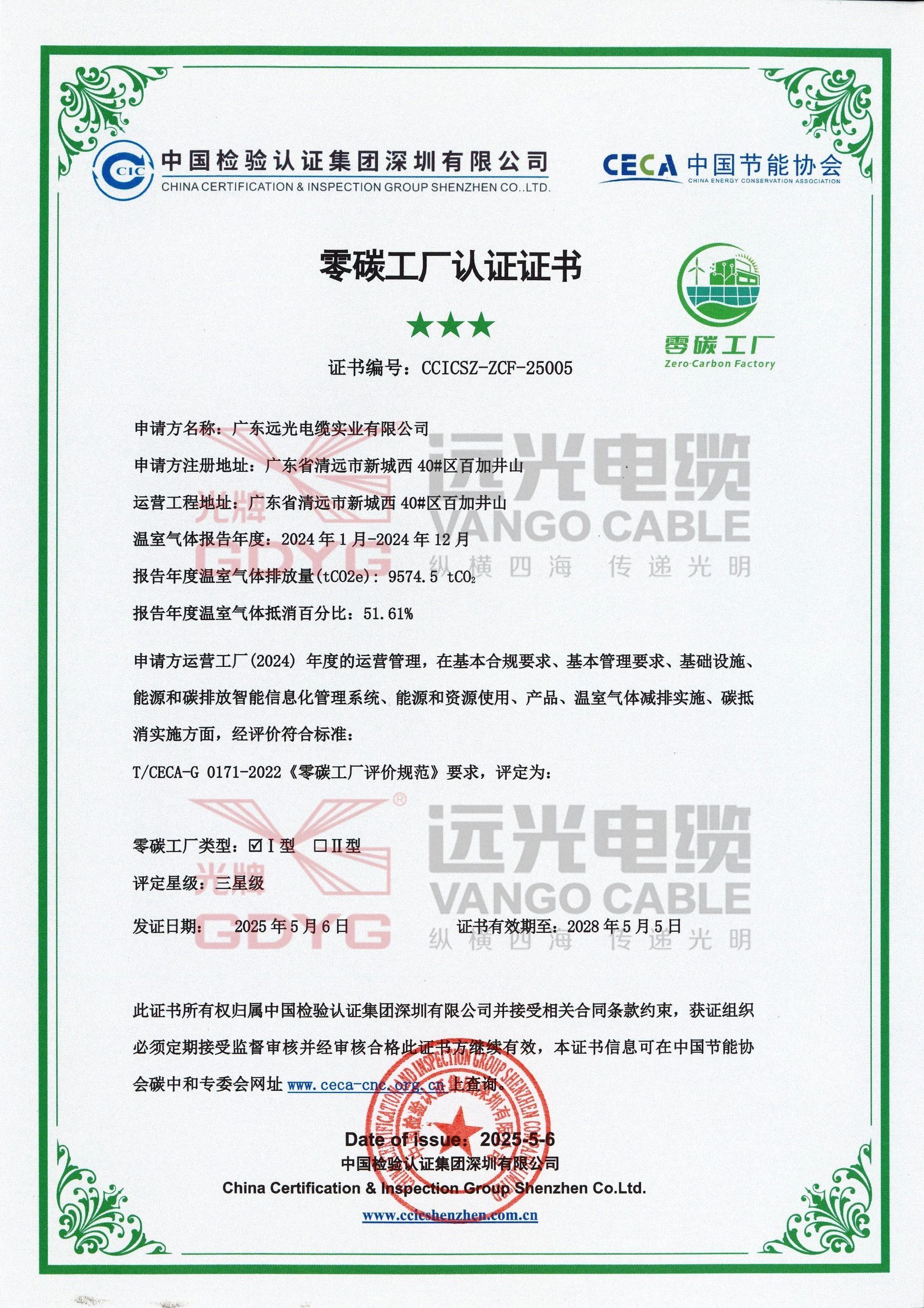 近日,广东远光电缆实业有限公司正式通过中国节能协会与中国检验认证集团深圳有限公司的联合评审,获颁“Ⅰ型三星”零碳工厂认证证书。作为电线电缆行业的绿色先锋,远光电缆积极响应国家“碳达峰、碳中和”战略部署,将可持续发展理念深度融入生产运营。继获评“国家级绿色供应链管理企业”“广东省省级绿色工厂”后,此次通过零碳工厂认证标志着远光在绿色制造、低碳转型领域取得里程碑式突破,为全行业绿色发展树立崭新标杆。