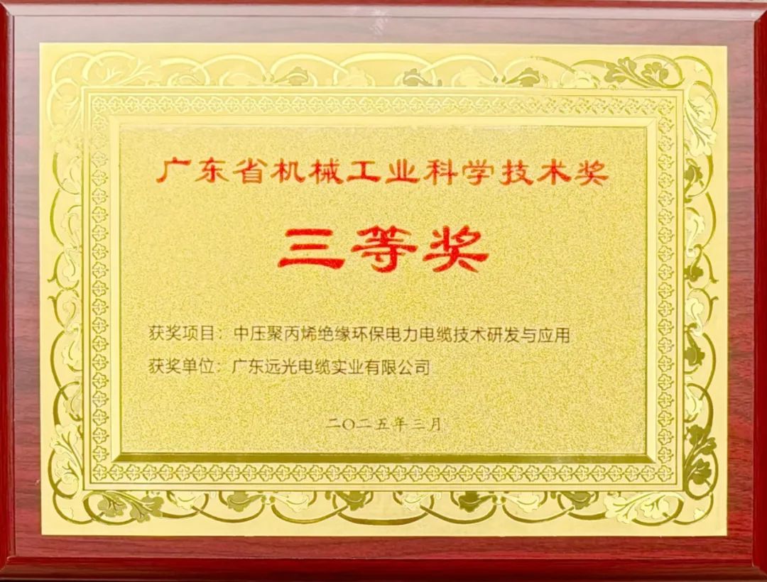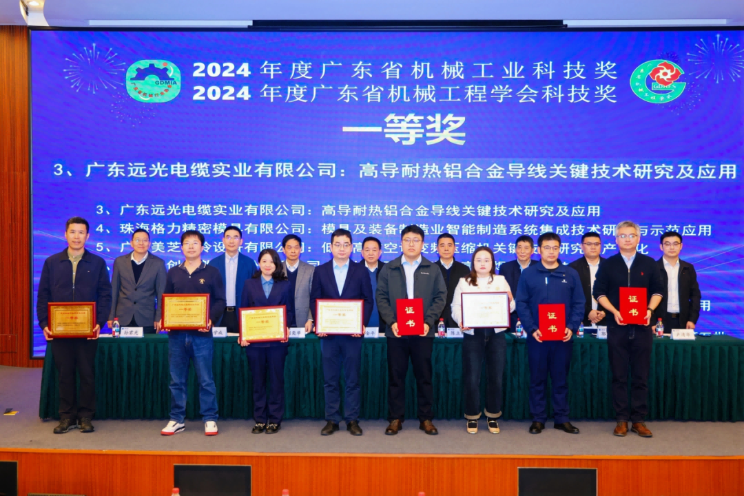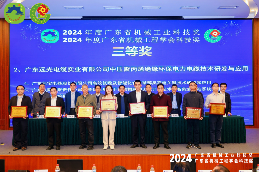 广东省机械工业科学技术奖作为省内机械制造领域最高科技荣誉之一,远光电缆凭借在绿色能源与材料创新领域的突出表现获得2项奖项!其中,“高导耐热铝合金导线关键技术研究及应用”项目荣获一等奖,“中压聚丙烯绝缘环保电力电缆技术研发与应用”项目斩获三等奖。