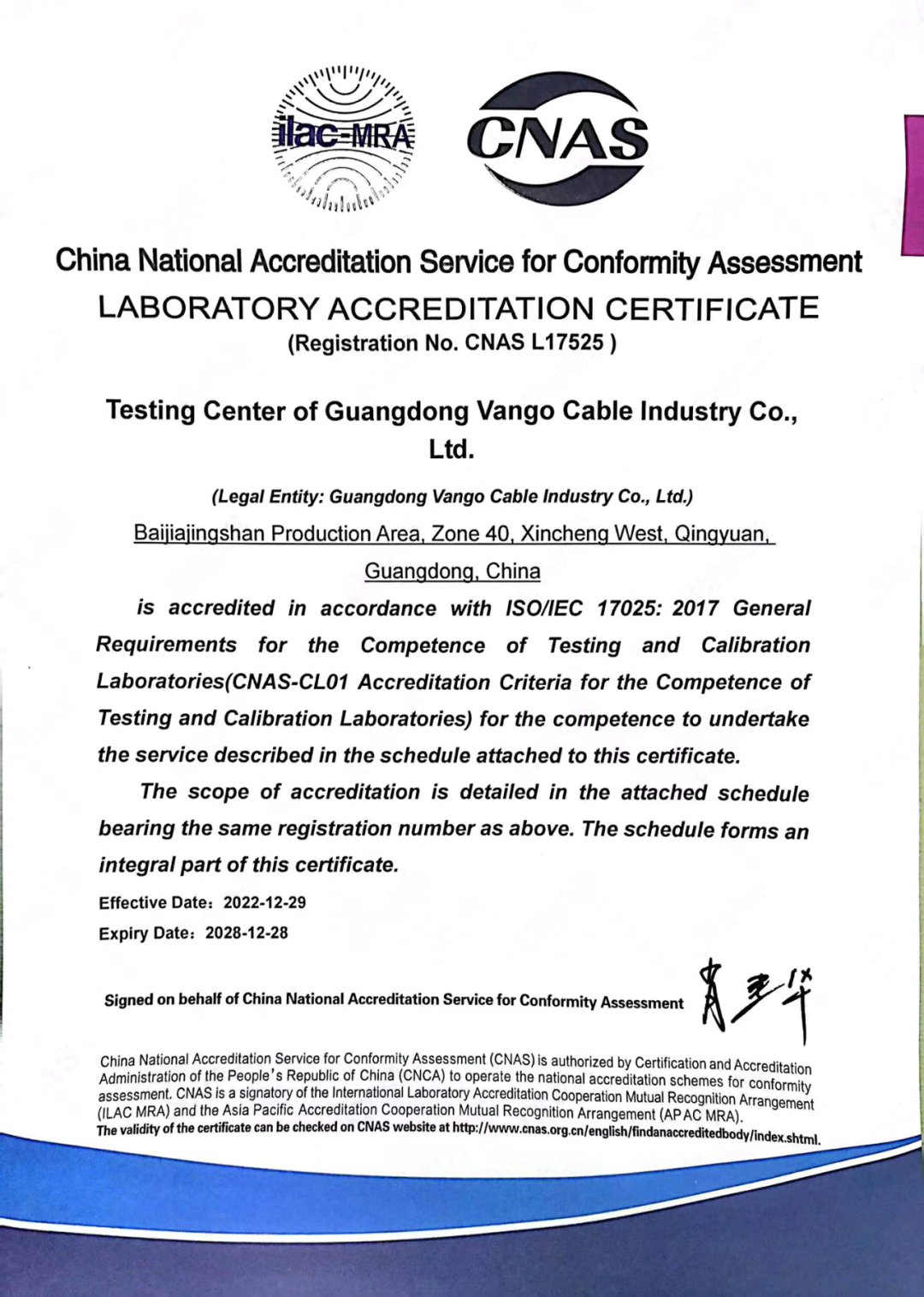 近日,远光电缆检测中心成功通过CNAS国家实验室认可标志和ILAC国际互认联合标志,获得由中国合格评定国家认可委员会颁发的实验室认可证书,注册号:CNAS L17525。通过CNAS认可,标志着远光电缆检测中心具备国家及国际认可的管理水平和检测能力,夯实了测量保证的基础,为企业提供优质的技术服务,为产品质量安全保驾护航。