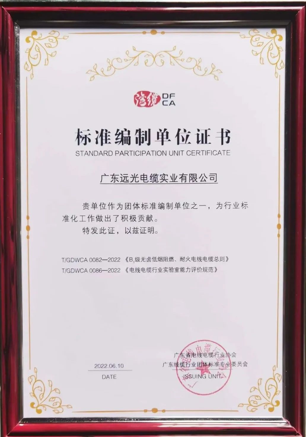 大会主办方对获得2021年度全国线缆百强(广东)的企业授牌,远光电缆再次荣获“广东线缆产业最具竞争力企业20强”称号。同时,远光电缆作为团体标准编制单位之一,被授予标准编制单位证书。