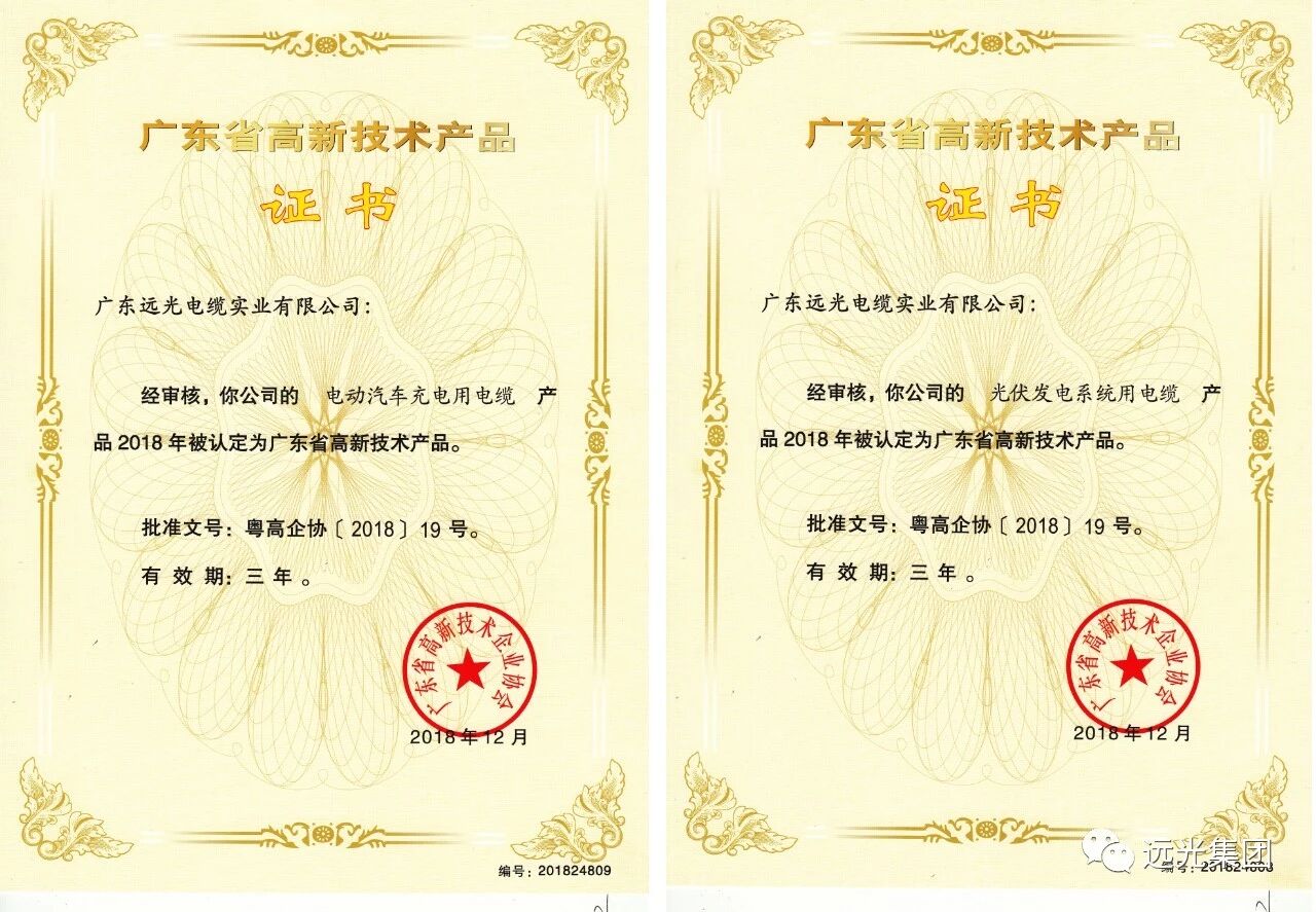 近日,广东省高新技术企业协会公布了2018年通过认定高新技术产品的名单,广东远光电缆实业有限公司(以下简称“远光电缆”)再添“光伏发电系统用电缆”、“电动汽车充电用电缆”两项高新技术产品。至此,远光电缆已有5项产品获得广东省高新技术产品认定。