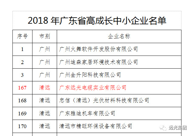 日前,广东省经济和信息化委员会公示了2018年广东省高成长中小企业名单,广东远光电缆实业有限公司名列其中。