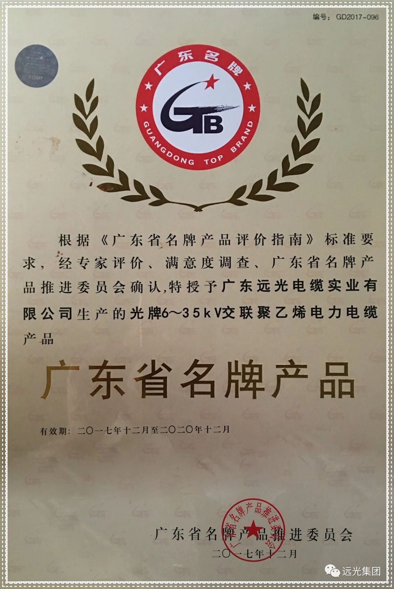 远光电缆光“牌”“6~35KV交联聚乙烯电力电缆”产品凭借卓越的产品性能、自主创新能力和良好的品牌信誉,在同行产品中脱颖而出,被授予“广东省名牌产品”称号。