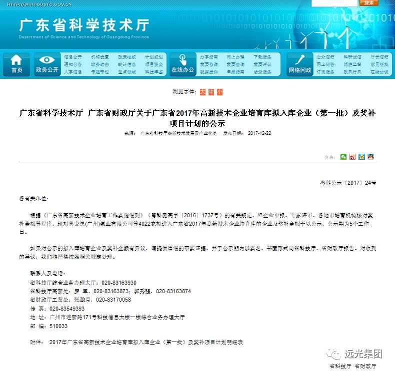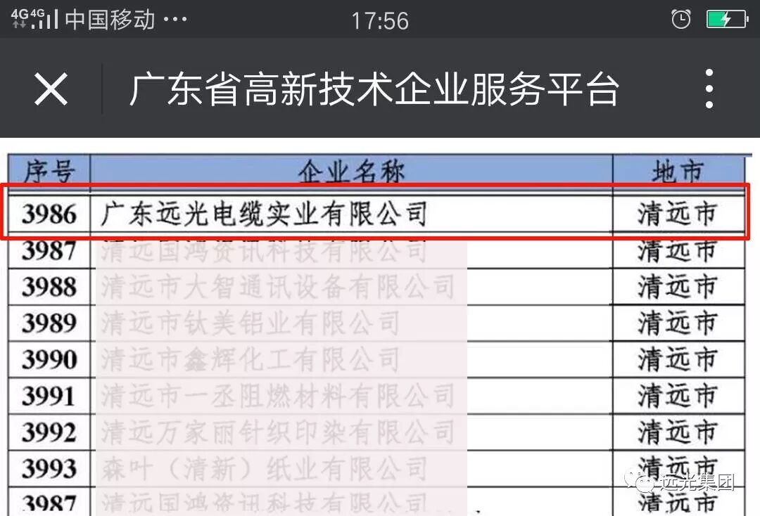 2017年12月22日,广东省科技厅、广东省财政厅下发《关于广东省2017年高新技术企业培育库拟入库企业(第一批)及奖补项目计划的公示 》,公布了广东省2017年第一批认定高新技术企业培育库拟入库名单,广东远光电缆实业有限公司名列其中。