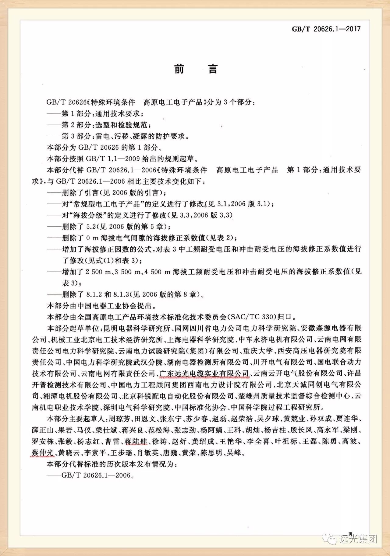 2017年9月29日,中华人民共和国国家质量监督检验检疫总局和中国国家标准化管理委员会共同发布了由广东远光电缆实业有限公司参加起草的GB/T 20626.1-2017 《特殊环境 高原电工电子产品 第一部分:通用技术要求》,标准将于2018年4月1日正式实施。