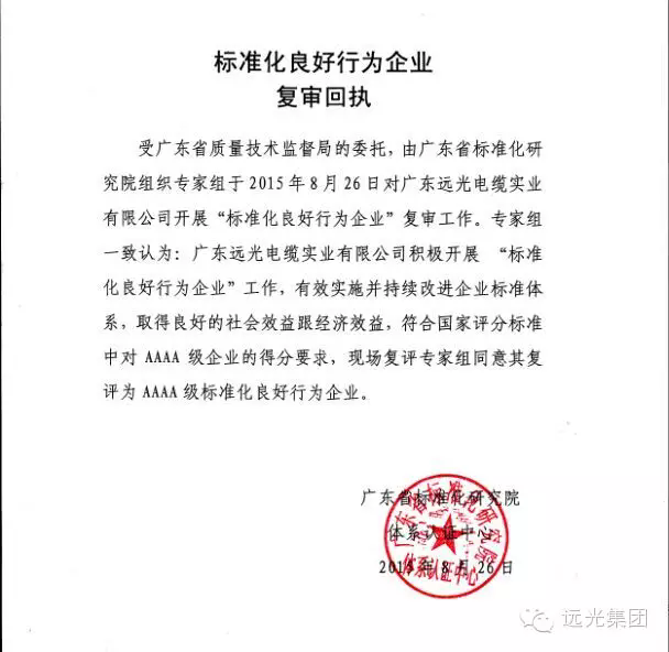 2015年8月26日,广东省标准化研究院和清远市质量技术监督局组成6人专家组对远光电缆的AAAA级标准化良好行为体系进行复审。经过评审,专家组一致认定远光电缆通过复审。