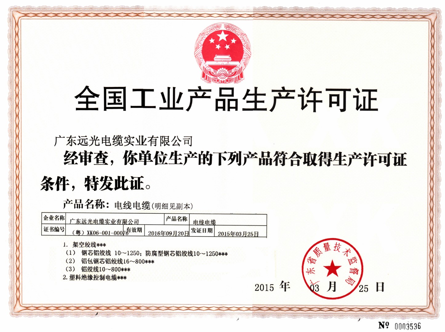 2015年4月13日,广东远光电缆实业有限公司的领取了由广东省质量技术监督局认证通过1250系列超特高压架空输电导线全国工业产品生产许可证。