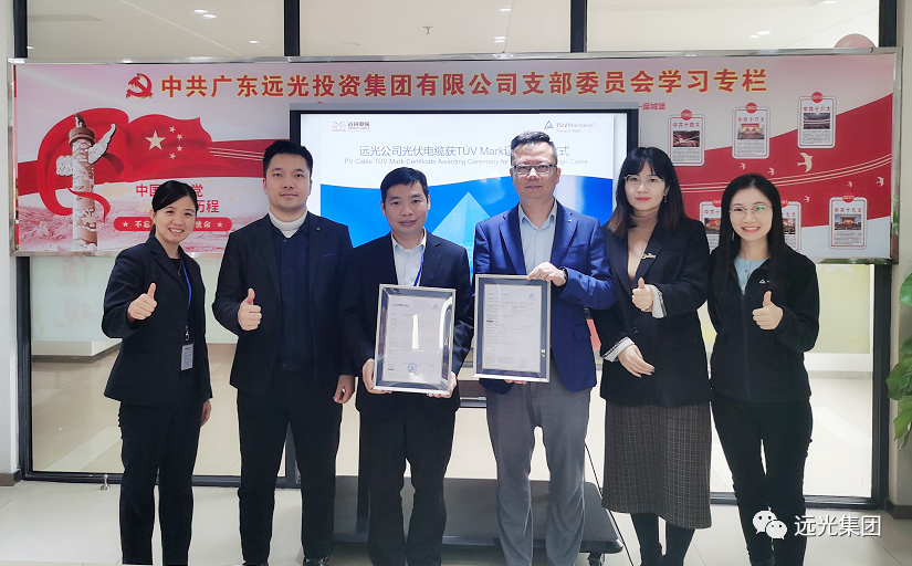 1月25日,国际独立第三方检测、检验和认证机构德国莱茵TÜV(以下简称“TÜV莱茵”)向广东远光电缆实业有限公司(以下简称“远光电缆”)颁发了TÜV莱茵认证证书。TÜV莱茵大中华区太阳能与商业产品服务部门经理武艺、资深项目经理张丽颖、销售副经理卢惠芬,远光电缆技术总监刘冠,高级工程师、技术经理许莉莉,董事长秘书赖建铭等出席了颁证仪式。